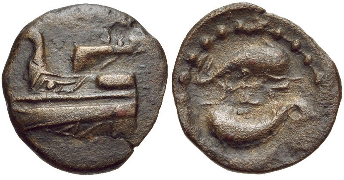 (x) Megaris, Megara (c. 350-275 BC), Æ Dichalkon, 13mm., 1.72g, 7h, prow left, upon which is set a tripod, rev. two dolphins swimming clockwise (Kroll 643; BCD Peloponnesos 9.5; HGC 4), dark brown patina, almost very fine