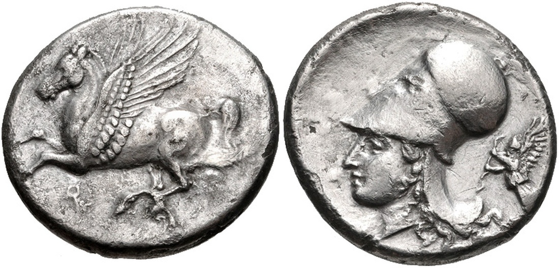 (x) Corinth (c. 375-300 BC), AR Stater, 8.11g, Pegasos flying left, rev. helmeted head of Athena left; to right, Nike flying left, carrying fillet (Pegasi I, 420; BCD Corinth 111), a trace of surface smoothing, otherwise very fine
