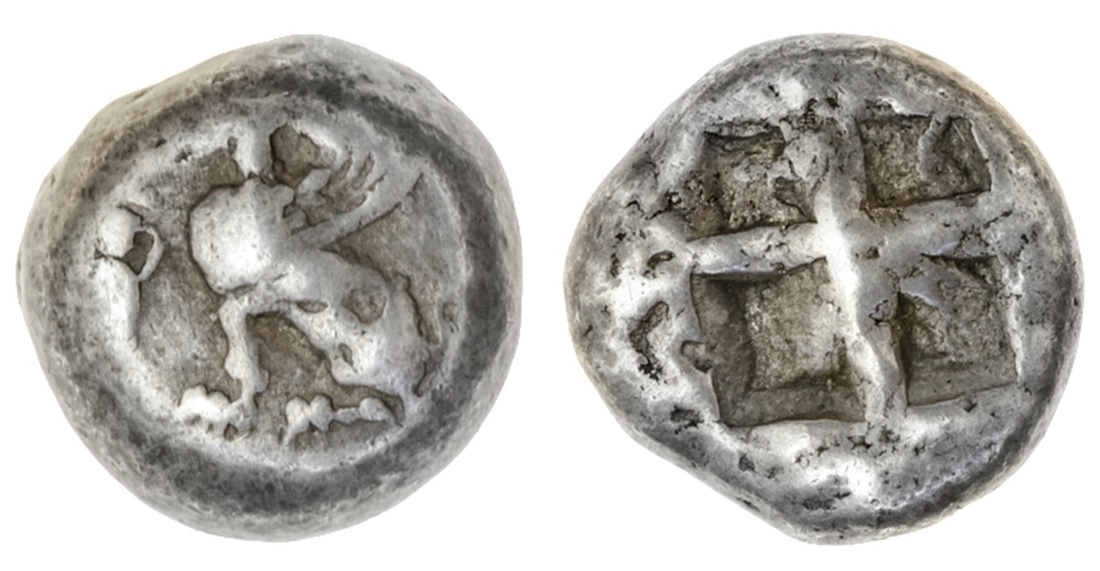 Ionian Islands, Chios (c. 490-435 BC), AR Stater, 7.82g, Sphinx seated left; amphora to left, rev. Quadripartite incuse square (Mavrogordato 21; SNG Copenhagen 1540-42), toned, a pleasing fine