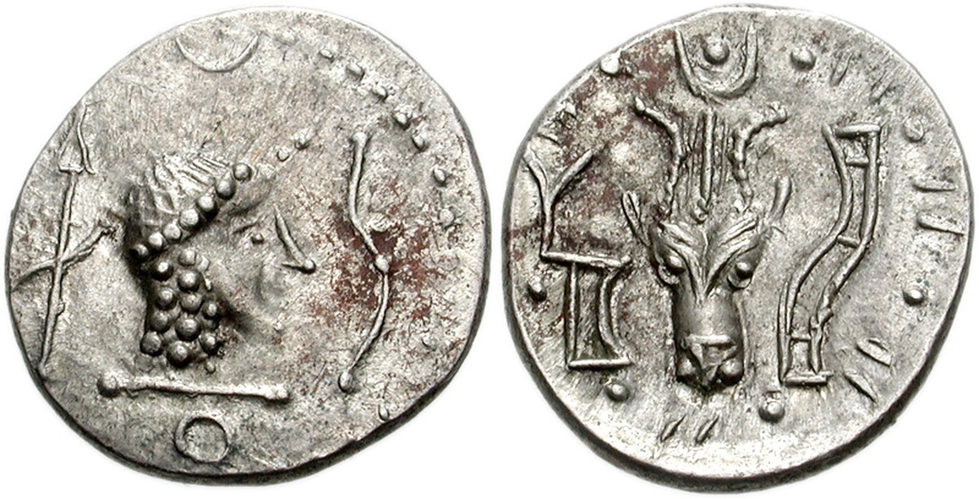 (x) Arabia Felix, Himyarites and Sabaeans, Saba (c. 1st Century AD), AR Unit, 16mm., 2.25g, 11h, head right; pellet within crescent above; spear and curved sign flanking; musnad letter below, rev. bucranium facing, pellet within crescent above, symbols flanking (Munro-Hay 2.3ai; SNG ANS -), good very fine