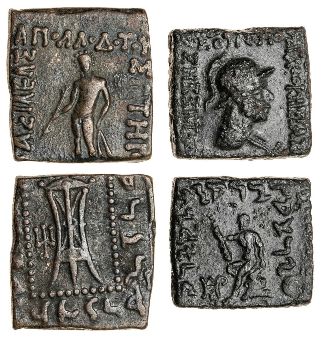 Indo-Greek, Apollodotus I (c.174-165 BC), square Æ Unit, Apollo standing facing, holding arrow and resting on bow, rev. tripod within square beaded frame (SNG ANS 371; Bop.Ser.6; Mitch.209), Agathocleia and Strato (c.135-125 BC), square Æ Unit, helmeted bust of Athena right, rev. Heracles seated on rock left, holding club on knee (SNG ANS.983; Bop.Ser.3; M.307), very fine (2)