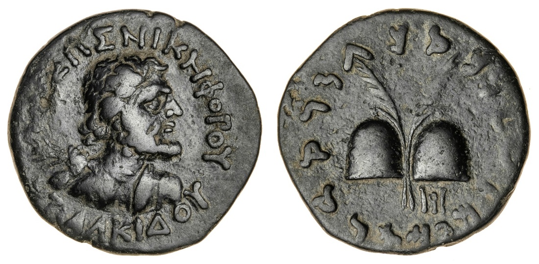 Indo-Greek, Antialcides (c.115-95 BC), Æ Unit, 6.89g, diademed bust of Zeus right, rev. pilei of the Dioscuri with palms between (SNG. ANS.1107; Bop.Ser.14; M.281), very fine