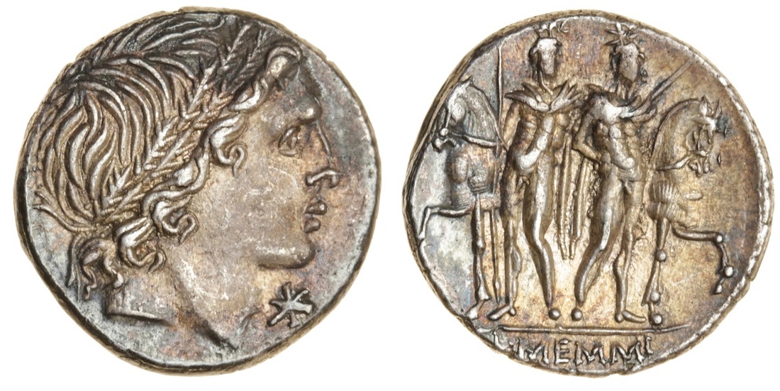 Roman Republic, L. Memmius (109-108 BC), AR Denarius, 4.06g, 7h, Rome, Apollo right, star below chin, rev. Dioscuri standing facing, between outfacing horses (RSC Memmia 1; Sydenham 558; RRC 304/1), attractive tone and well-centred, about extremely fine