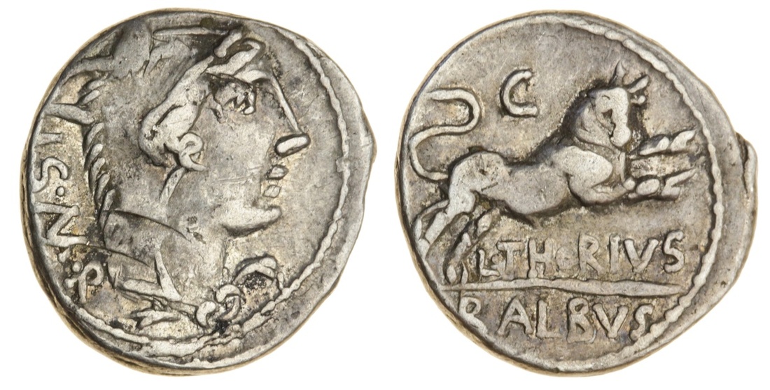 Roman Republic, L. Thorius Balbus (105 BC), AR Denarius, 3.88g, 8h, Rome, Juno Sospita right, L S MR behind, rev. Bull rearing right, C above, L. THORIVS BALBVS below (RSC Thoria 1; Sydenham 594; RRC 316/1), slightly off-struck with some marks to bust, otherwise good fine