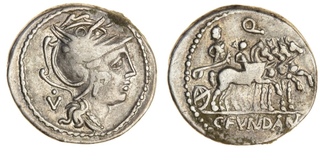 Roman Republic, C. Fundanius (101 BC), AR Denarius, 3.82g, 6h, Rome, helmeted Roma right, V and dot behind, rev. Quadriga right, Q above, C. FVNDAN in exergue (RSC Fundania 1; Sydenham 583; RRC 326/1), deposits at 1 o'clock, otherwise good fine