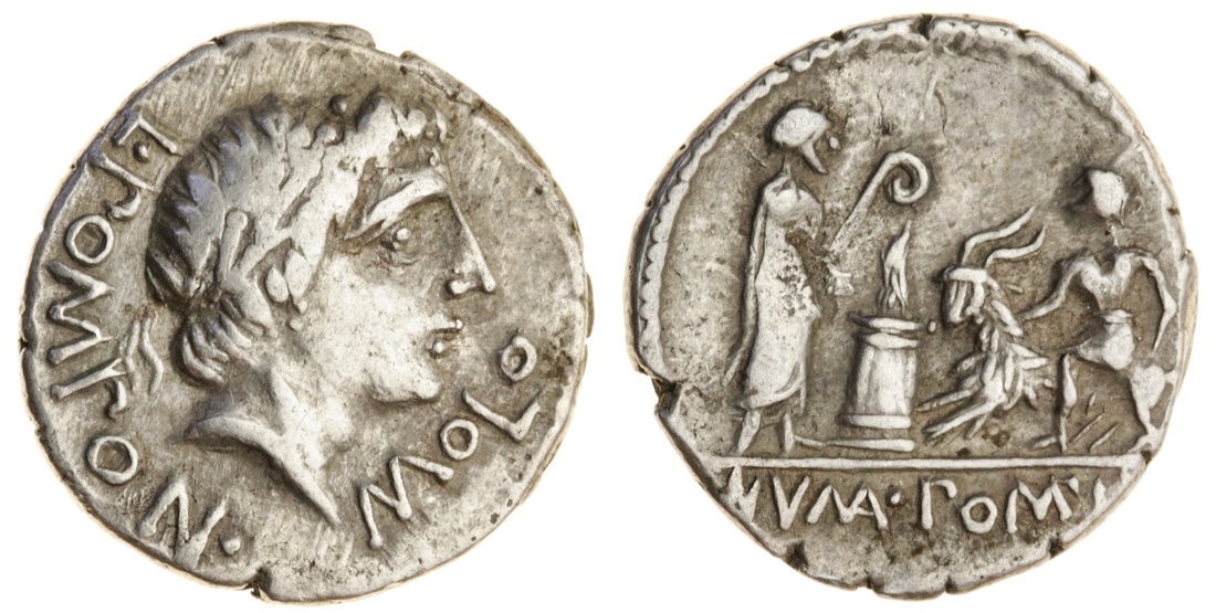 Roman Republic, L. Pomponius Molo (97 BC), AR Denarius, 3.88g, 4h, Rome, laureate Apollo right, L. POMPON . | MOLO around, rev. Numa Pompilius, holding lituus behind lighted altar to which victimarius, leads goat, NVMA. POMP in exergue (RSC Pomponia 6; Sydenham 607; RRC 334/1), well-centred, good fine