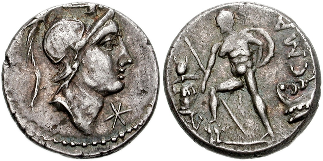 (x) Roman Republic, C. Poblicius Malleolus (96 BC), AR Denarius, 3.98g, helmeted Mars right, feather on helmet, mallet above, mark of value below chin, rev. Warrior standing left, with right foot on cuirass, holding spear; trophy to left, grasshopper on prow to right (RSC Poblicia 6; Sydenham 615a; RRC 335/3d), lightly toned, very fine