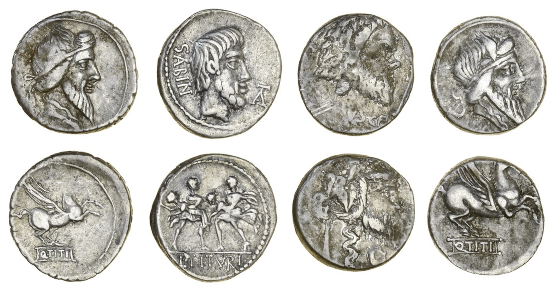 Roman Republic, AR Denarii, Rome (8), including C. Vibius C.f. Pansa (90 BC), 3.81g, mask of Silenus right, wearing ivy-wreath, rev. mask of Pan right (RSC Vibia 8; Sydenham 689); another, Q. Titius (90 BC) (2), 4.20g and 3.43g, Mutinus Titinus [Priapus] right, rev. Q. TITI on tablet, Pegasus springs forth (RSC Titia 1; Sydenham 691); also, L. Titurius L.f. Sabinus (89 BC), 3.99g, Tatius right, rev. rape of the Sabine women (RSC Tituria 1; Sydenham 698a); Anonymous issue (86 BC), 3.95g, laureate Apollo right, thunderbolt below, rev. Jupiter-driven Quadriga right (RSC 226; Sydenham 723); lastly, Mn. Fonteius C.f (85 BC) (3), 3.81g, 3.75g and 3.96g, laureate head of Vejovis right, monogram or C.F below chin, thunderbolt below head, rev. infant winged Genius seated on goat (RSC Fonteia 9-10; Sydenham 724-24a), all lightly toned, the first fair, scarce, the rest good fine to almost very fine (8)