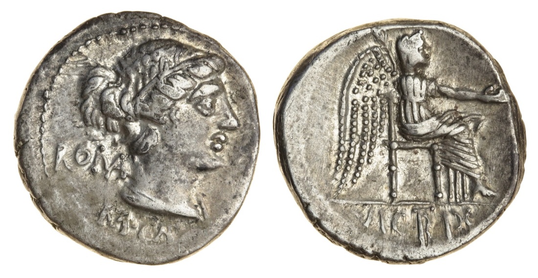Roman Republic, M. Porcius Cato (89 BC), AR Denarius, 3.90g, 9h, Rome, draped bust of female right, ROMA behind, M. CATO below, rev. Victory seated right, VICTRIX in exergue (RSC Porcia 5; Sydenham 596; RRC 343/1b), light smoky tone, very fine or better