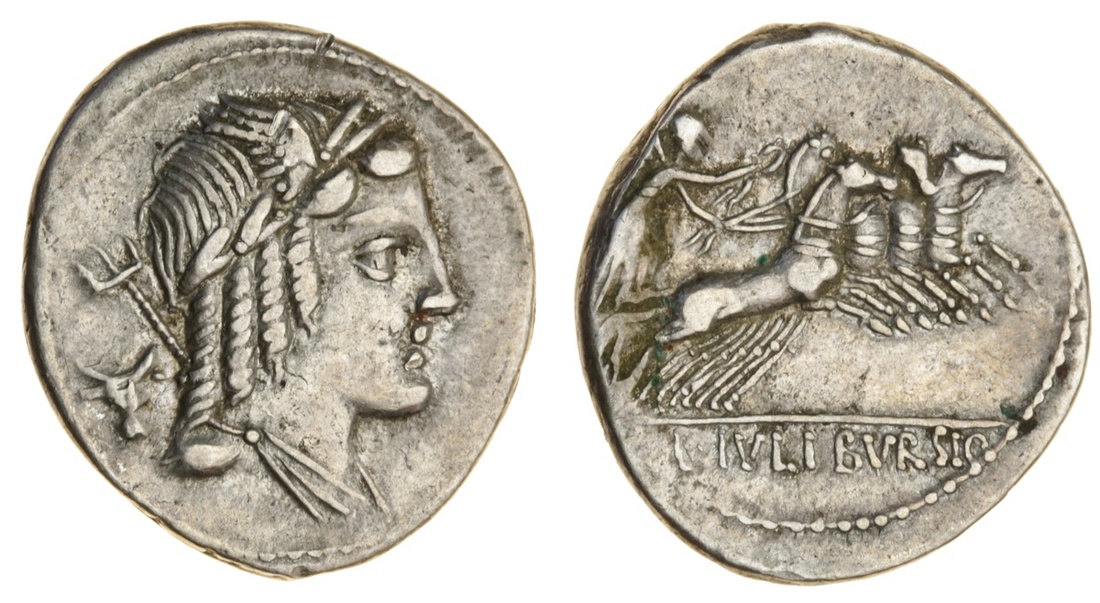 Roman Republic, L. Julius Bursio (85 BC), AR Denarius, 3.65g, 7h, Rome, laureate Vejovis right, trident and bucranium behind, rev. Quadriga right, fields plain, L. IVLI BVRSIO in exergue (RSC Julia 5; Sydenham 728; RRC 352/1a), very fine