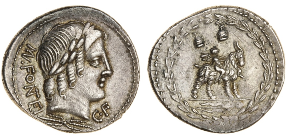 Roman Republic, Mn. Fonteius C.f. (85 BC), AR Denarius, 3.95g, 6h, Rome, large laureate head of Vejovis right, thunderbolt below, MN. FONTEI | CF around, rev. Genius seated on large goat right, filleted thyrsus in exergue, pilei of the Dioscuri above, hanging from all-encompassing laurel wreath (RSC Fonteia 10; Sydenham 724a; RRC 353/1c), a hint of tone and neatly centred, near extremely fine