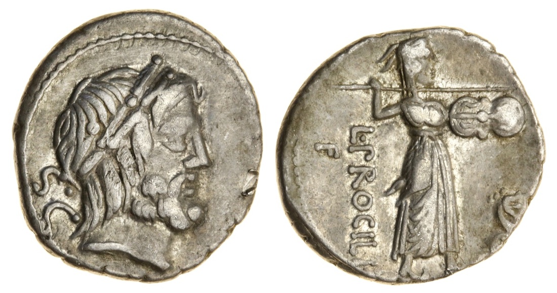 Roman Republic, L. Procilius (80 BC), AR Denarius, 3.74g, 4h, Rome, laureate Jupiter right, S.C. behind, rev. Juno Sospita walking right, brandishing spear, serpent before, L. PROCILI / F in field (RSC Procilia 1; Sydenham 771; RRC 379/1), light tone, about very fine