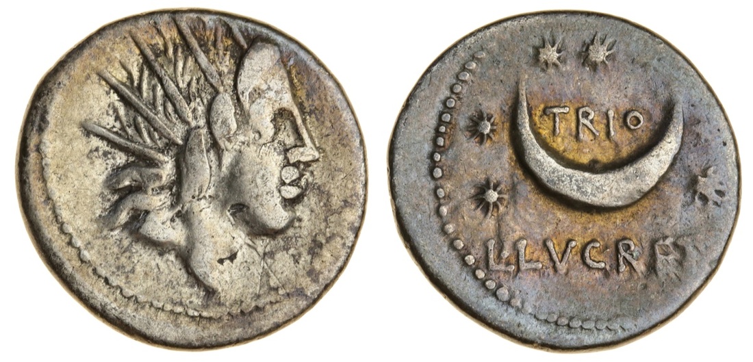 Roman Republic, L. Lucretius Trio (76 BC), AR Denarius, 3.66g, 5h, Rome, radiate Sol right, rev. crescent surrounded by seven stars, L. LVCRET[I] in field below, TRIO above (RSC Lucretia 2; Sydenham 783; RRC 390/1), rubbed, but with attractive rainbow tone, good fine