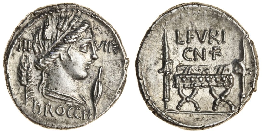 Roman Republic, L. Furius Cn.f. Brocchus (c. 63 BC), AR Denarius, 3.87g, 6h, Rome, Ceres right, flanked by corn ear and barley, III-VIR above, BROCCHI below, rev. curule chair, flanked by fasces, L. FVRI // CN. F above (RSC Furia 23; Sydenham 902; RRC 414/1), bright and well-centred with some superficial scuffs, otherwise about extremely fine