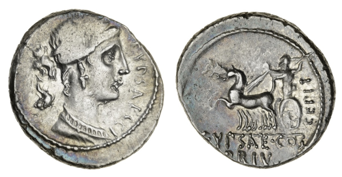 Roman Republic, P. Plautius Hypsaeus (60 BC), AR Denarius, 4.00g, draped bust of Leuconoe right, dolphin behind,