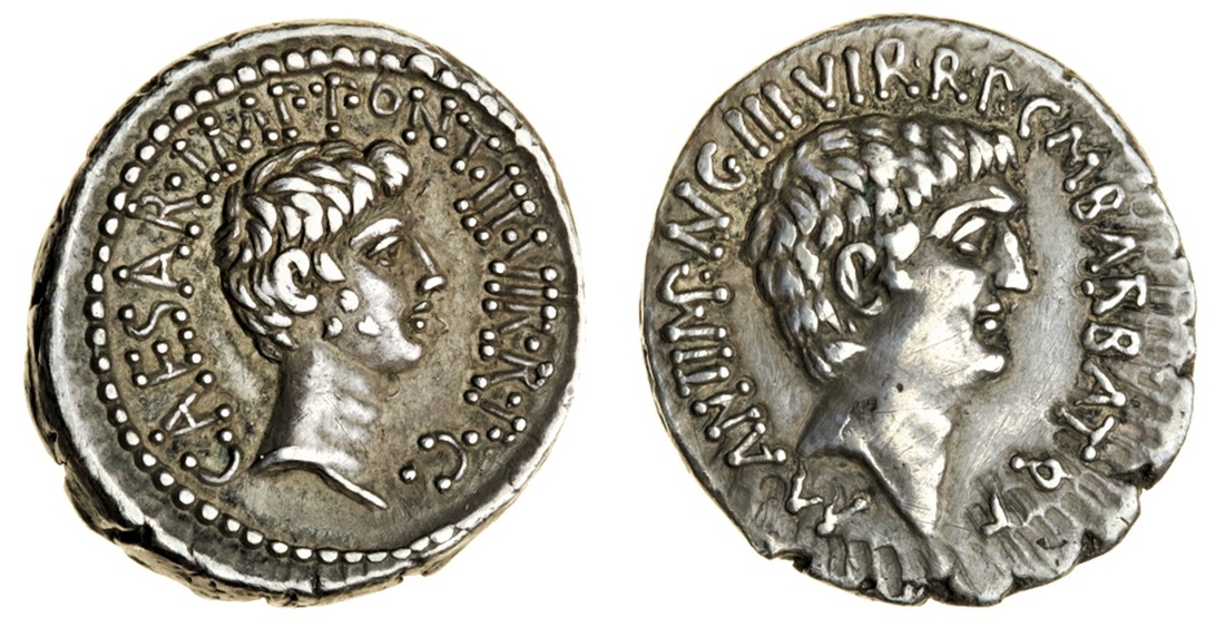 Roman Imperatorial, Second Triumvirate, M. Antonius and G. Octavius, with M. Barbatius Pollio (43-33 BC), AR Denarius, 41 BC, bare head of Antony right; M•ANT•IMP•AVG•III•VIR•R•P•C•M•BARBAT•Q•P around, rev. bare head of Octavian right, with slight beard;