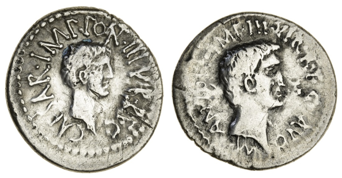 Roman Imperatorial, Second Triumvirate, M. Antonius and G. Octavius (43-33 BC), AR Denarius, 3.63g, military mint traveling with Antonius in Syria [?], c. Autumn 41 BC, bare head of 'Antony' right, rev. bare head of 'Octavian' right (RSC 2; CRI 251; Sydenham 1194; RRC 528/3), from an academic's handling collection, hence rubbed, otherwise well-centred, fine or better, rare