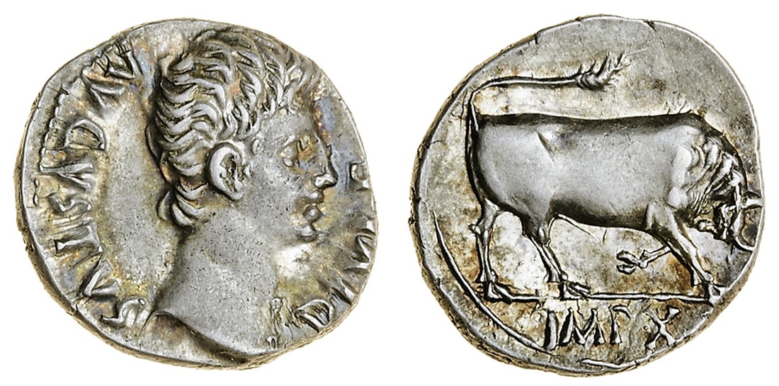 Augustus (27 BC-14 AD), AR Denarius, 3.73g, Lugdunum, c. 14-12 BC, AVGVSTVS DIVI F, bare head right, rev. bull butting right, IMP X in exergue (RSC 137; RIC 167a), lustrous, the bull struck in magnificent high relief, extremely fine
