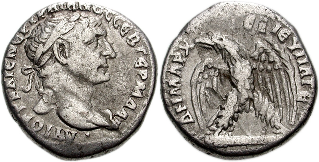(x) Roman Provincial, Phoenicia, Trajan (98-117), BI Tetradrachm, 24mm., 13.96g, Tyre, year RY 15 [AD 111], laureate head right, rev. Eagle standing facing on club, wings spread, head turned to left; palm right (Prieur 1504), lightly toned, about very fine