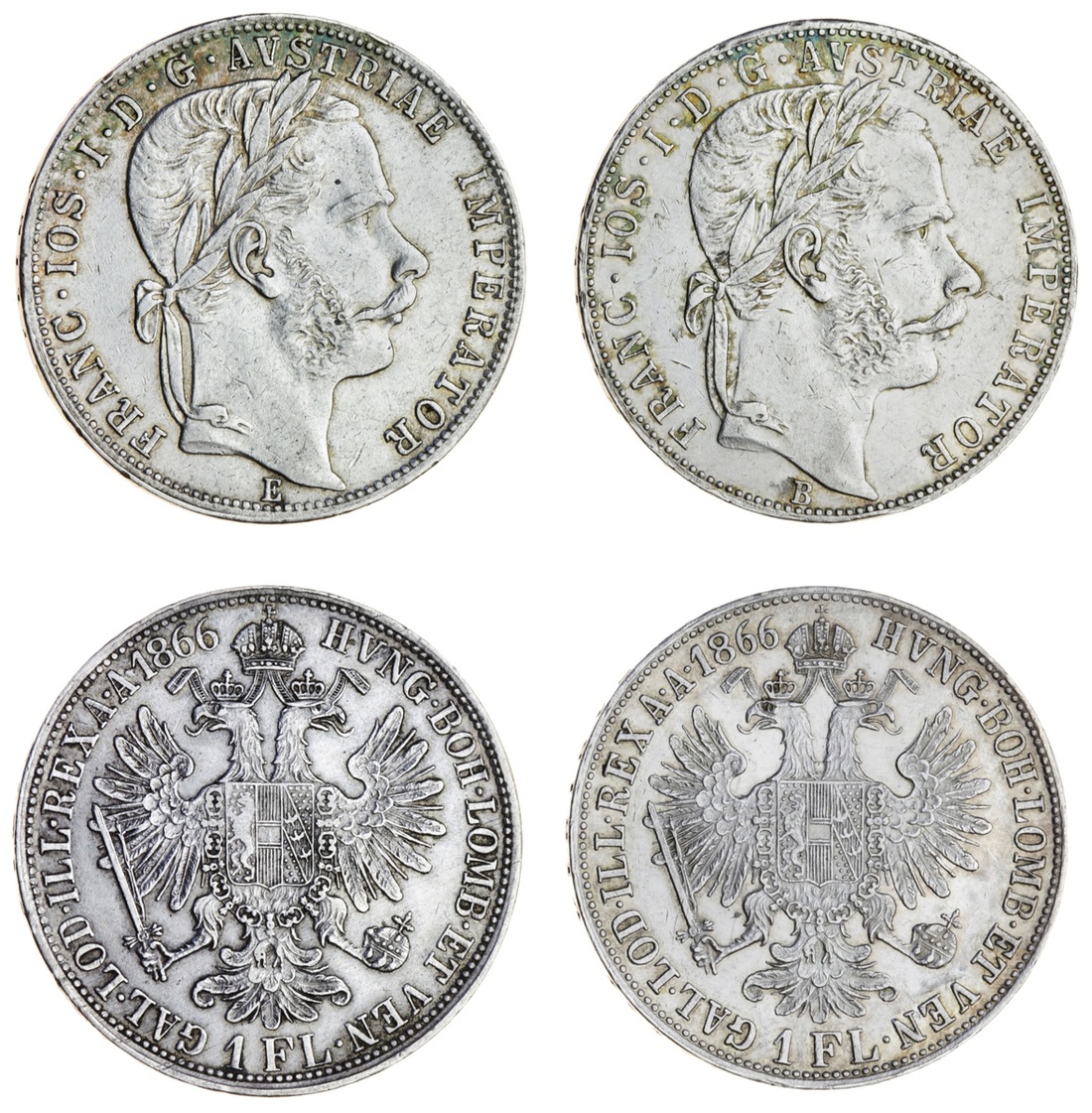Austria, Franz Joseph (1848-1916), Florin (2), 1866 B, 1866 E, head right, rev. crowned double headed eagle (KM 2220), good very fine, the first scarce, the second rare (2)