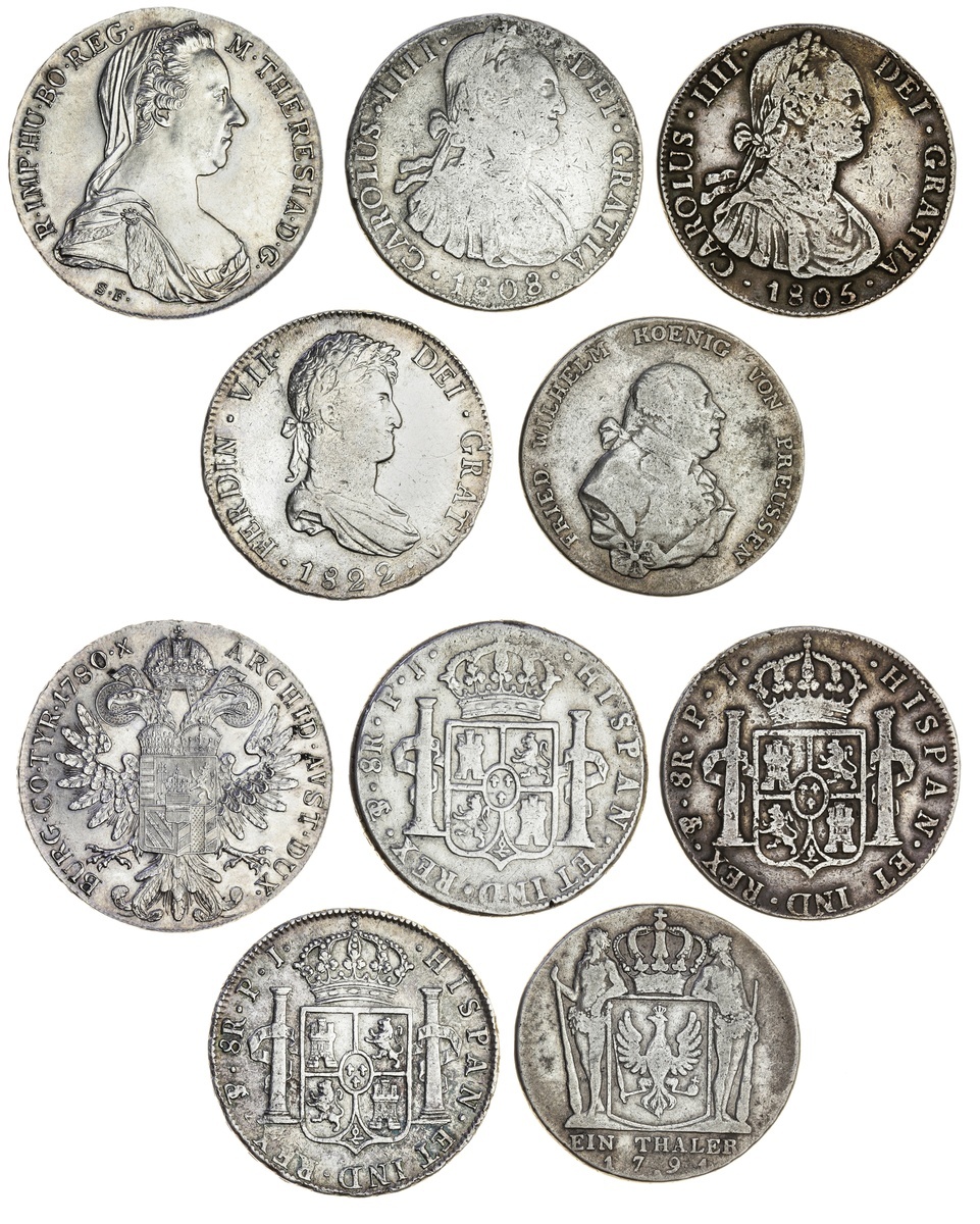 (x) Bolivia, 8-Reales (3) 1805-PJ, 1808-PJ, 1822-PJ; additionally, miscellanoeus, Germany, Prussia, Thaler, 1791-A; and Austria, Maria Theresia, Thaler 1780 restrike (KM 73(2), 84, 360.1, 1866.2r), fine, fine, about very fine, albeit cleaned, fine, and extremely fine (5)