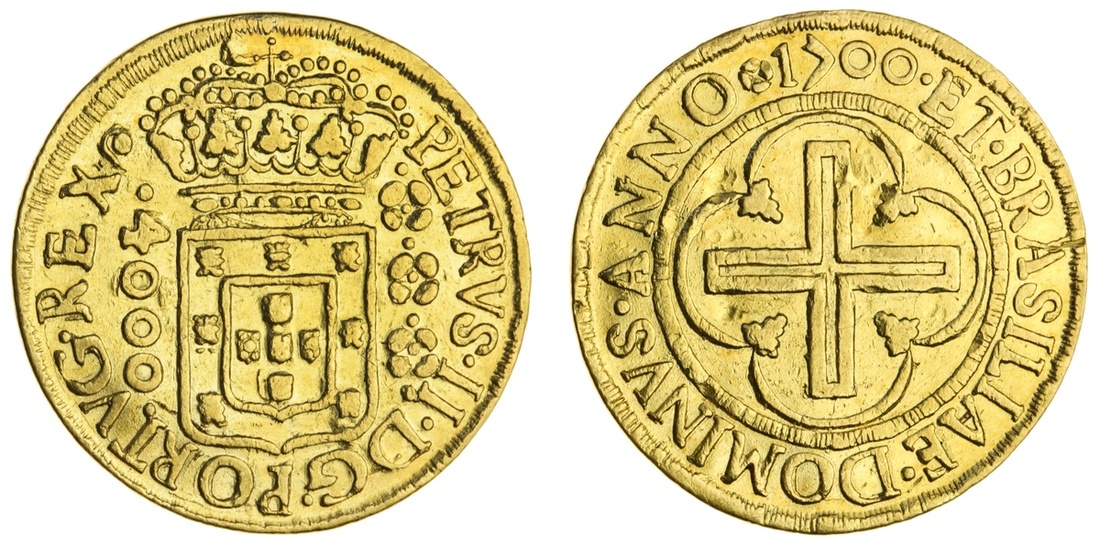 (x) Brazil, Pedro II (1683-1706), gold 4,000-Réis, 1700, Bahia, 7.96g, 12h (Heritage 3012, lot 23158, same dies; LDMB 32; Gomes 33.08; F.21; KM 89), from a mount, cleaned and some dents, otherwise a bolder very fine
