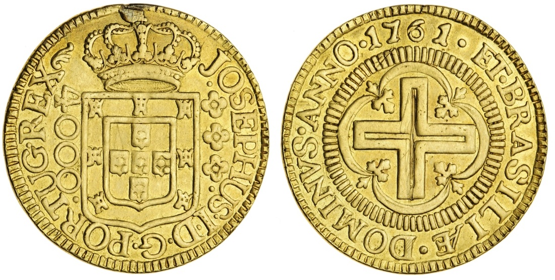 (x) Brazil, Jose I (1750-77), gold 4,000-Reis, 1761, crowned shield, rev. plain cross in quadrilobe (KM 171.2; F.73), mount removed, scratches, very fine