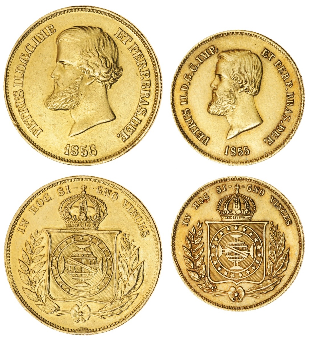 (x) Brazil, Pedro II (1831-89), 10,000-Reis, 1856, and 5.000-Reis, 1855, old bust, rev. crowned shield in wreath (KM 467, 470; F.122, 123), first from a mount, both about very fine (2)