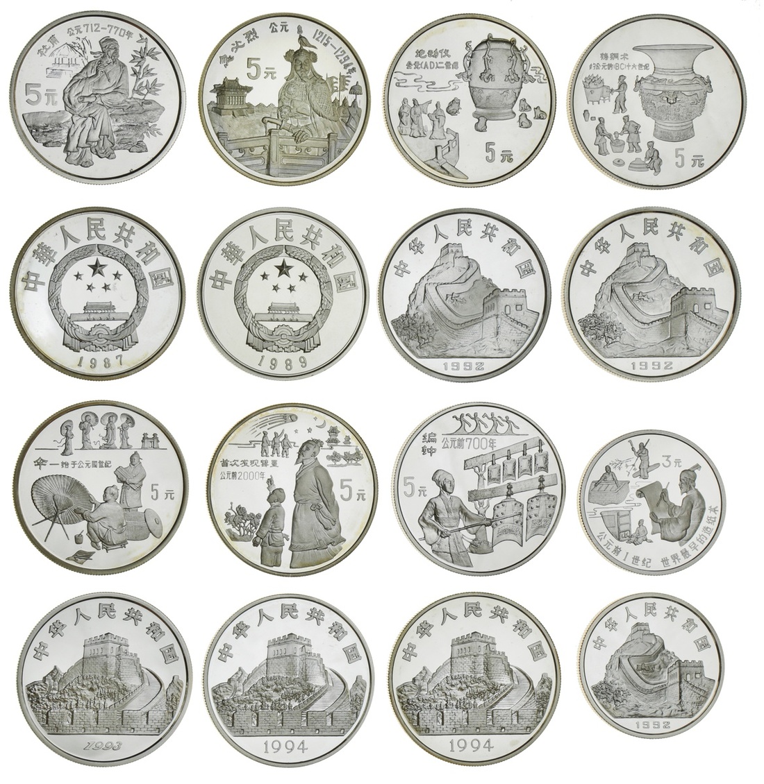 China, People's Republic, silver Proof 5-Yuans (7), 1987, 1989, 1992 (2), 1993, 1994 (2), and 3-Yuan, 1992, all different, brilliant uncirculated (8)