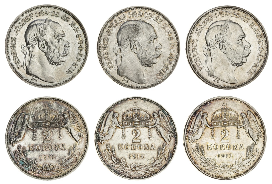Hungary, Franz Joseph (1848-1916), 2-Korona (3), 1912, 1913, and 1914, all Kremnitz (KM 493), the first two brilliant uncirculated, the last extremely fine and scarce  (3)