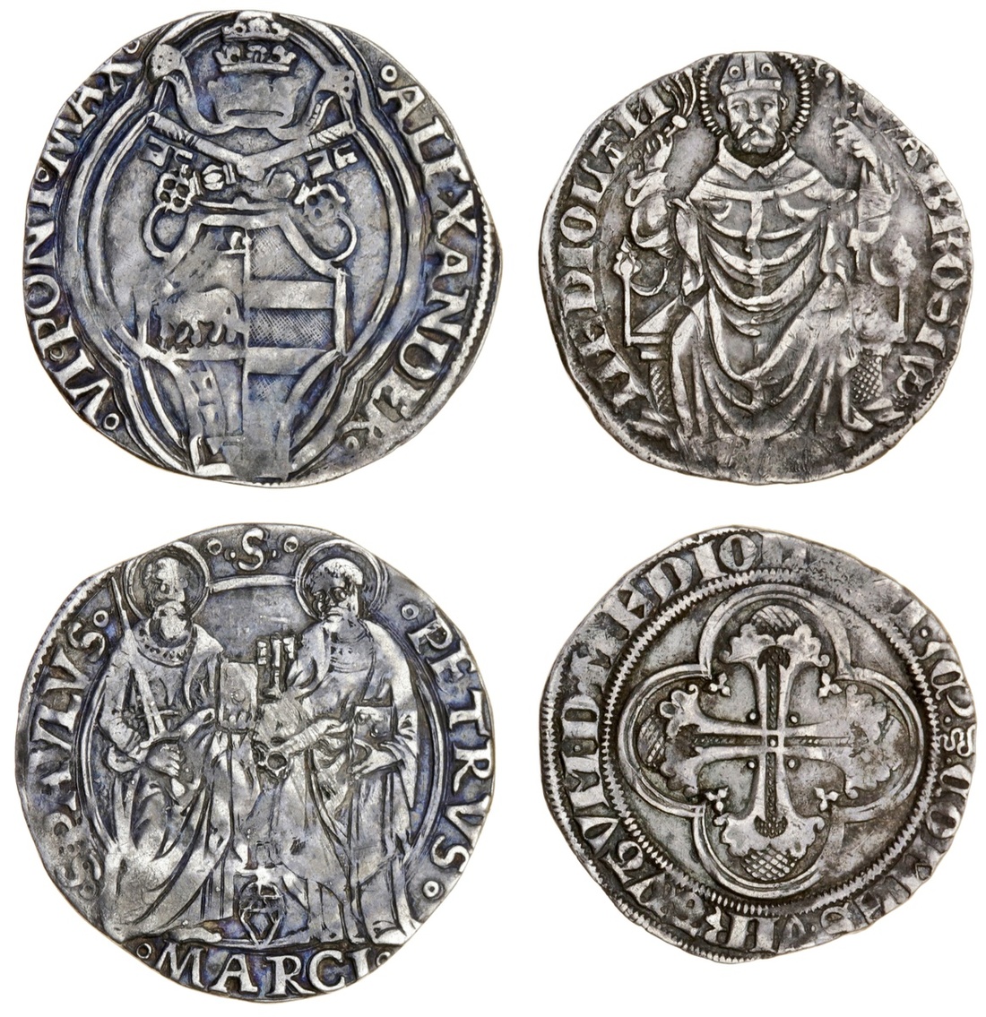 (x) Italy, Vatican, Alexander VI (1492-1503), Grosso, Ancona, Borgia arms in quadrilobe, rev. saints Peter and Paul, monogram between (Berman 538), also Milan, Gian Galeazzo Visconti (1395-1402), Grosso, cross fleury in quadrilobe, rev. St. Ambrose (MIR 119), both about very fine (2)