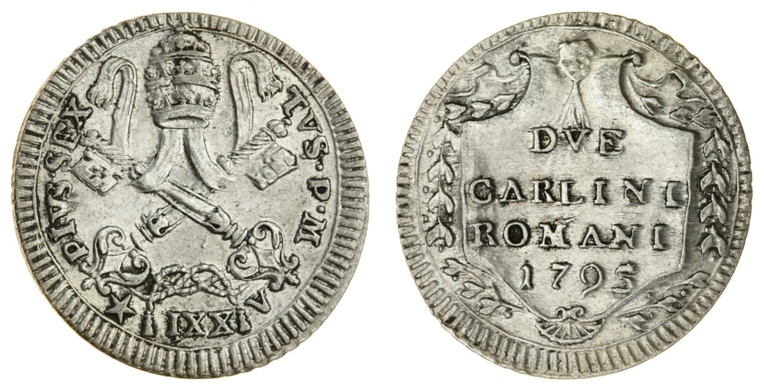 Italy, Vatican, Pius VI (1775-99), Due-Carlini, 1795, anno XXI, 9.56g, Papal tiara over crossed keys, rev. value in cartouche (Berman 2977), about extremely fine