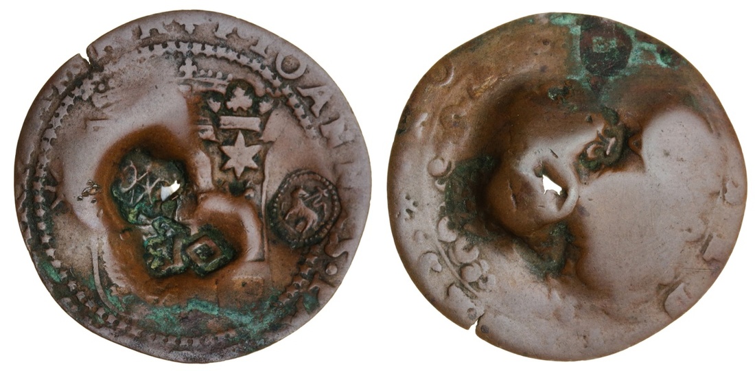Malta, The Knights of St. John, Giovanni-Paolo Lascaris di Ventimiglia e Castellar, 57th Grand Master (1636-57), AE 4-Tari, weight? 3h, bearing the countermarks of four subsequent Grand Masters, i) crowned star of six-points [Ramon Despuig, 67th, stamp instituted: 13 Dec. 1740]; ii) MA monogram [Manuel Pinto, 68th, stamp instituted: 30 May 1766]; iii) crowned lozenge [Emmanuel de Rohan-Polhuc, 70th, stamp instituted: 19 Jun. 1777 and 10 Jan. 1778]; another, paschal lamb [stamp instituted 17 Jul. 1792 and 29 Oct. 1792] (Restelli & Sammut 50-60), concave appearance, one countermark causing a flan perforation, the host coin good, the countermarks fine or better