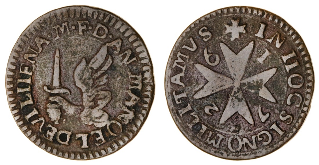 (x) Malta, The Knights of St. John, Manoel de Vilhena (1722-36) Æ Grano, 1726, Maltese cross with date in angles, rev. winged arm brandishing sword (Restelli 135; KM 140), about very fine, brown patina