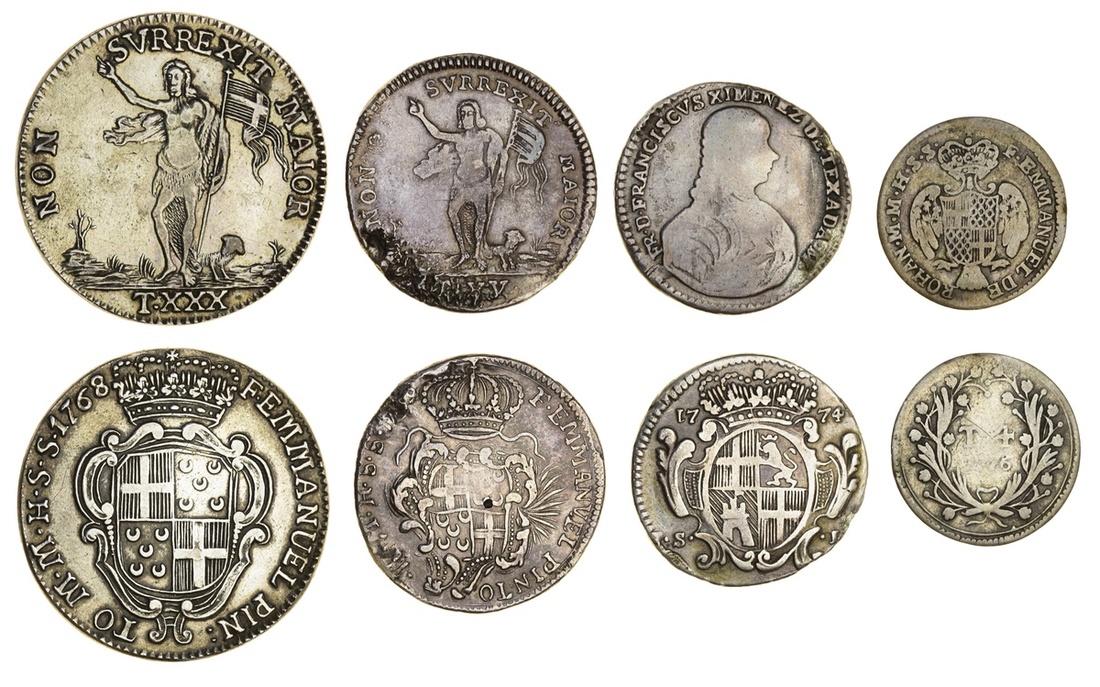 Malta, The Knights of St. John, Emmanuel Pinto de Fonseca, 68th Grand Master (1741-73), Valetta (3), AR 30-Tari, 1768, weight? 6h (Restelli & Sammut 91; KM 266), removed from circular mount, polished and edge filed round, otherwise about very fine, scarce; also, 15-Tari, 1759, weight?, 6h (Restelli & Sammut 101), possibly sea-salvage, clasp mounted at 2, 4, 8 and 10 o'clock, otherwise toned, fine, scarce; lastly, 4-Tari, 1776, weight?, 12h (Restelli & Sammut 56), fair, but rare; additionally, Francisco Ximenes de Texada y Eslava, 69th Grand Master (1773-75), AR Scudo, 1774, Valetta, inverted 1 in date, weight? 6h (Restelli & Sammut 21), removed from a clasp mount, with edge damage at 2, 4 8 and 10 o'clock, otherwise fair to fine (4)