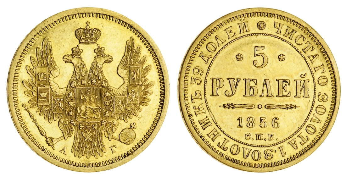 (g) Russia, Alexander II (1855-81), gold 5-Roubles, 1856, St. Petersburg, eagle, rev. value (Fb.163, Bitkin 2), lustrous, extremely fine