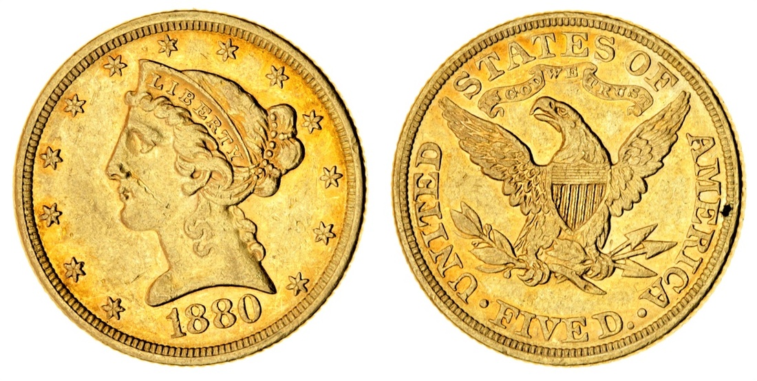 (g) USA, 1880 $5 'Liberty Head' (gold Half-Eagle), Philadelphia, by Christian Gobrecht (F.143; KM 101; NGC ID 25XA; PCGS ID 8351), drag mark on cheek, otherwise some tone, very fine/good very fine
