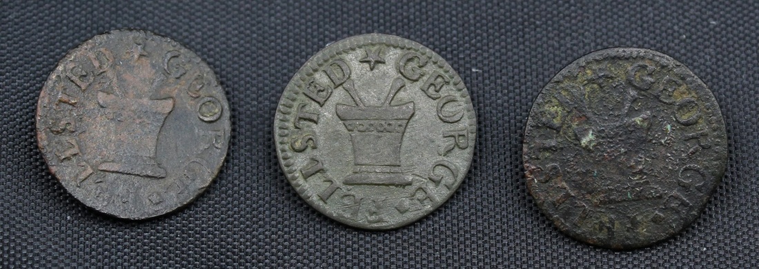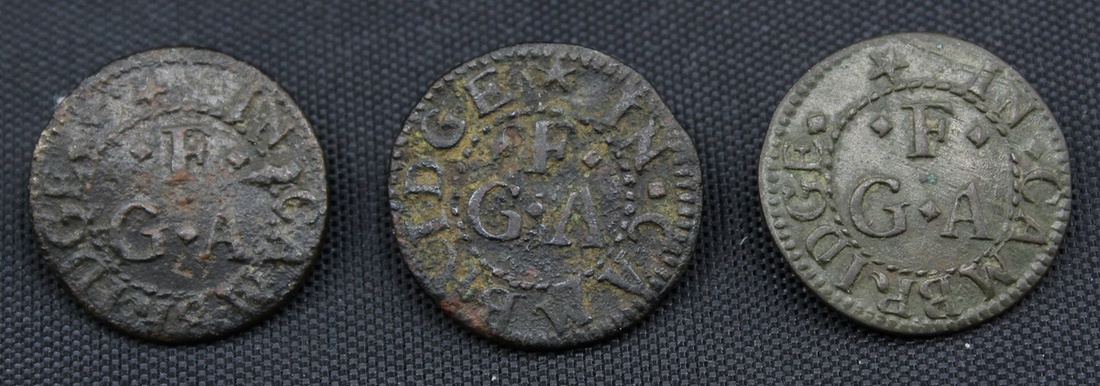 Cambridge, George Felsted (Councilman), Farthings, undated, in copper alloy, 6h, m.m. star, (m.m.) GEORGE • FELLSTED, two pestles and mortar, rev. (m.m.) IN • CAMBRIDGE •, • G •F •A in centre (Cooper [1845] pp. 541; Babington 25; Searle 23; Boyne & Williamson 41; SCBI Norweb I, 383; Dickinson, Cambs 41), delightful patina, almost extremely fine; another, similar to last, but with die flaw by CAMBRIDGE, surface porosity, almost very fine; another, similar but different dies 'E to top of F' (Dickinson, Cambs 41b), light surface porosity, otherwise a bolder fine (3)