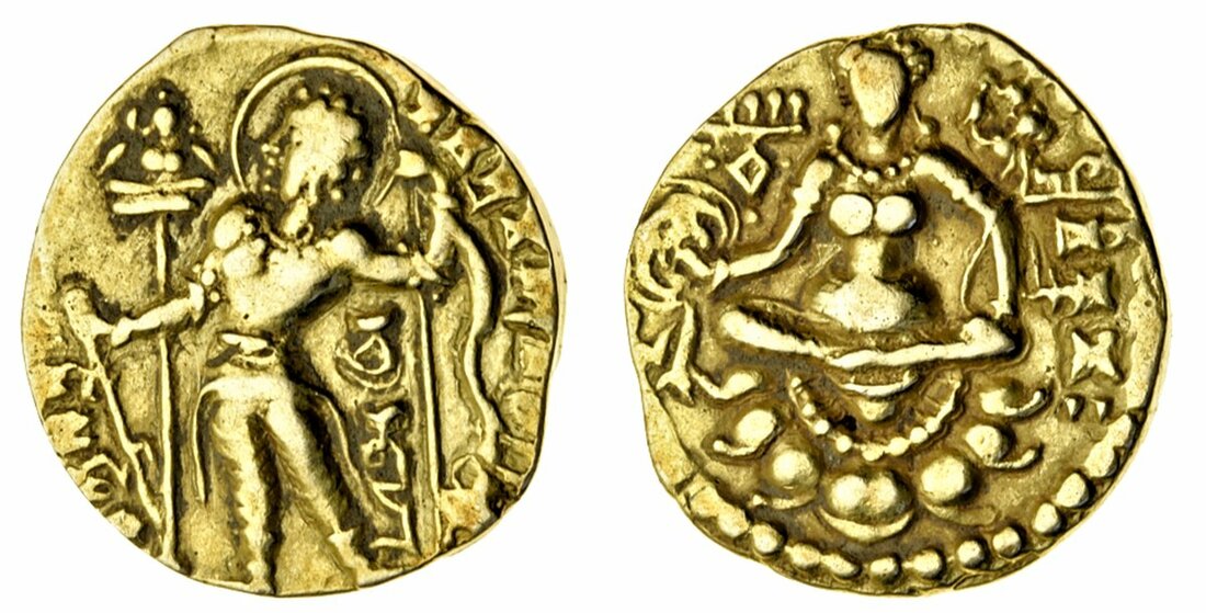 India, Gupta Empire, Chandragupta II (c. 380-414), gold Dinar, 6.72g, archer type, nimbate king with curly hair standing left, holding bow right, candra below arm, Garuda standard left, rev. goddess Lakshmi seated facing on a lotus, holding a garland and a long-stemmed lotus, Sri Vikrama right (Kumar, Class III, A.5.1; BMC plate VII), good very fine