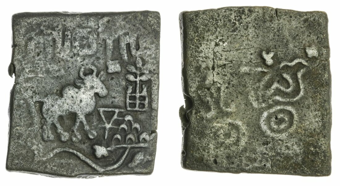 South India, Vidarbha, 'Sebaka' (c.150-100 BC), square AE unit, bull standing right before 6-arched hill, yupa and tree in railing, Brahmi legend rano sebakasa above, rev. srivatsa symbol left, nandipada right (MSI. vol 1. 131 var; Pieper 589 var), with more symbols on obverse than known type, fine to good fine and scarce