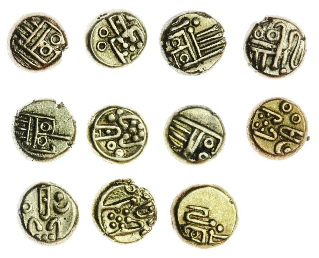 South India, Tamil Nadu (c. 1650-1800), gold 'Kali' Fanams (11), stylised 'viraraya' design, a local type issued by the British at Madras, the Dutch at Negapatnam and Tuticorin, and the Nawabs of Arcot (Herrli, Fanams type 3), many variants, all slightly different, good very fine or better (11)