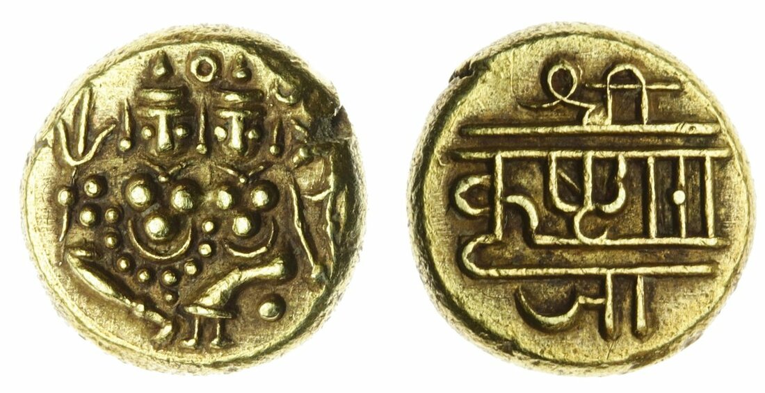 South India, Mysore State, Krishnaraja Wodeyar (1810-68), gold Pagoda, 3.35g, Siva and Parvati seated facing, rev. Devanagari legend sri krishnaraja (Mitchiner, South India,1.1089-90; KM 210), fault on edge, probably original, very fine