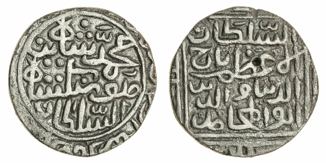 Muhammad's reign covered the years 838-839 but gold and silver Tankas of the present type are dated AH840. This coin was either issued posthumously by adherents of Muhammad or his son, Mas'ud Khan, or Muhammad's reign actually extended into the year AH840.