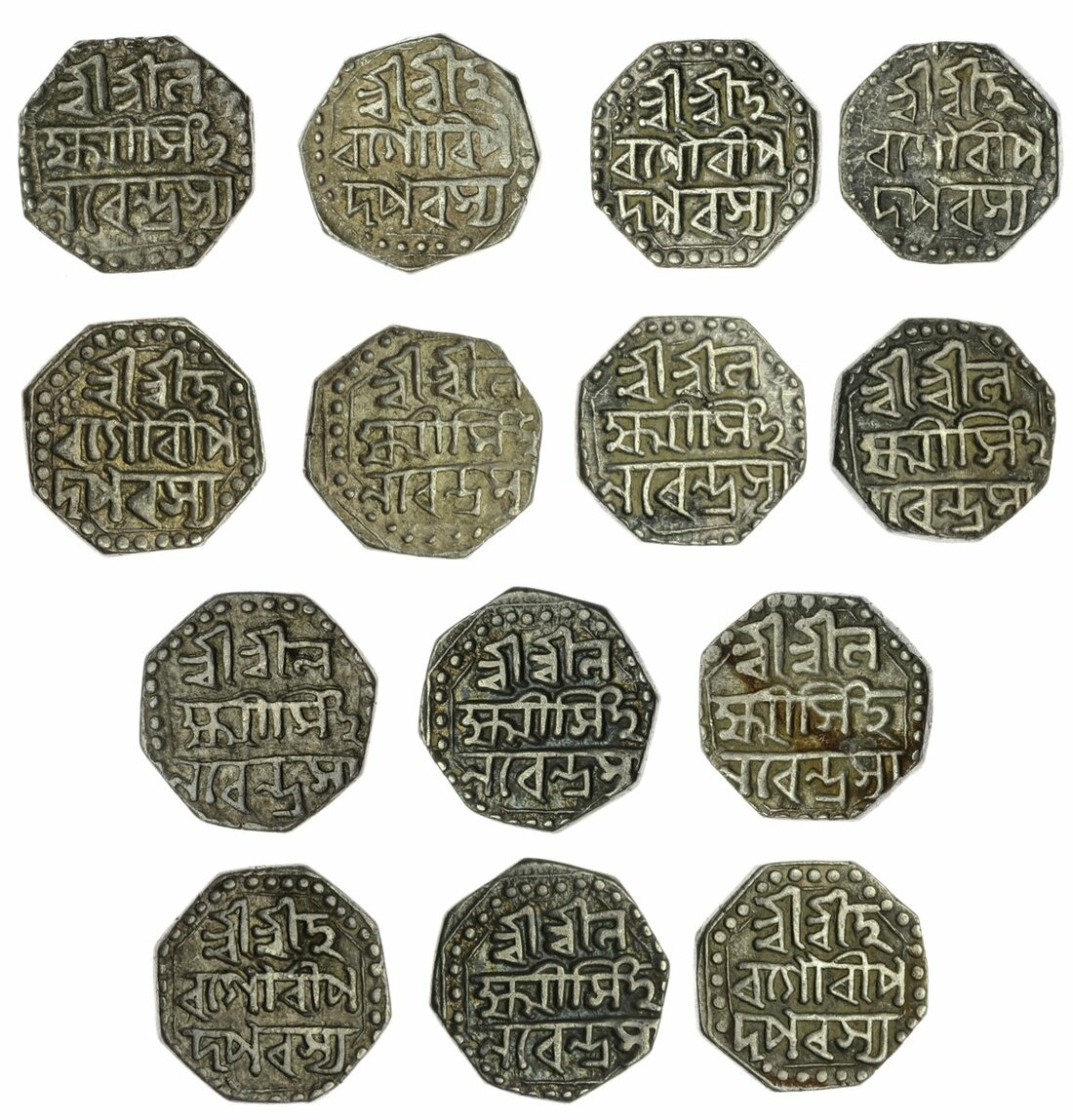 Assam, Lakshmi Simha (1769-80), octagonal Half-Rupees, undated, with invocation to Śiva and Parvati, Śri Śri Ha/ra Gauri Pa/da Parasya, rev. Śri Śri La/ksmi Simha Na/rendrasya, with some variation in the layout of the legends on either side (RB. Q36, Q37; KM. 178,179), very fine (7)