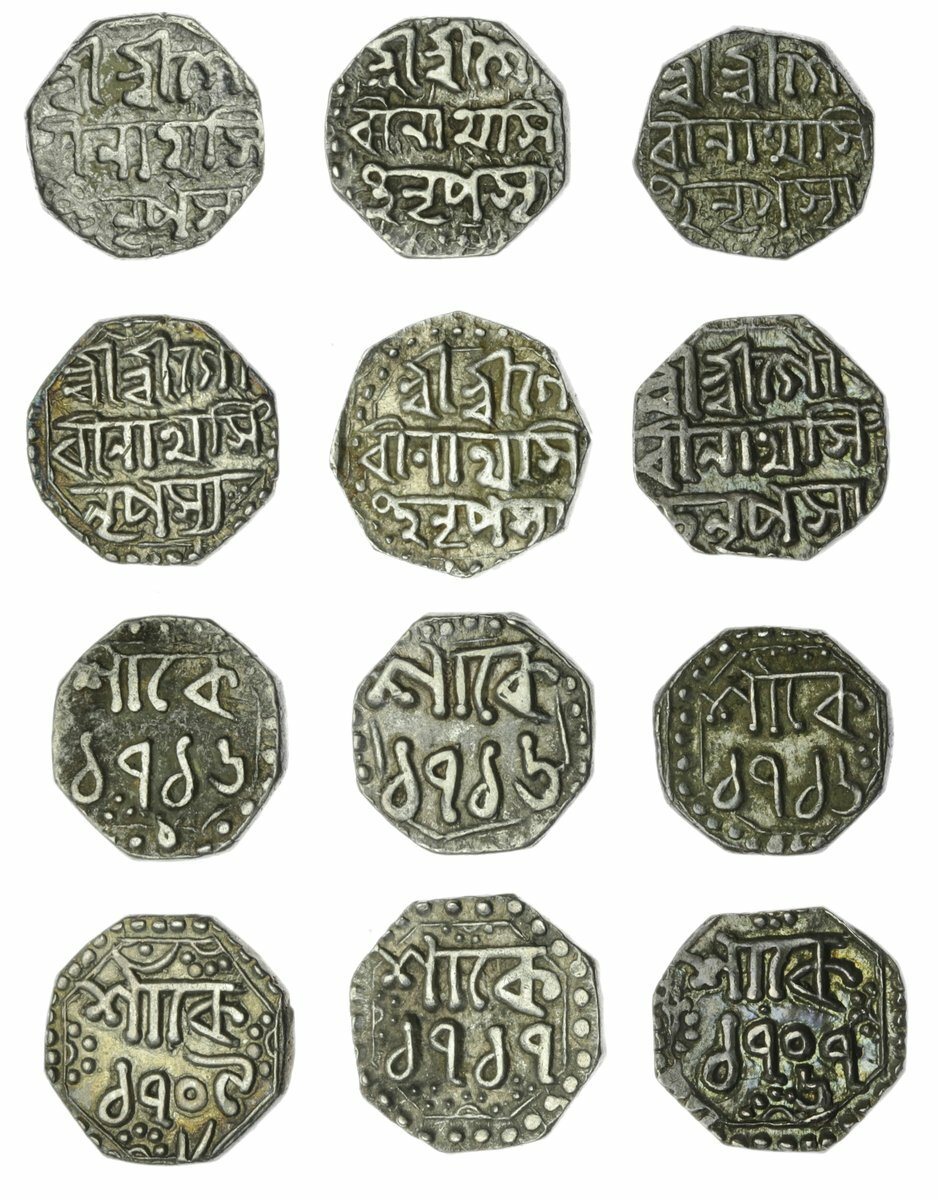Assam, Gaurinatha Simha (1780-95), octagonal Quarter-Rupees (6), 1707, year 6, 1709, year 8, 1716, figure 1, 1716 (2), different dies with varying dot patterns, 1717 (RB. R96.1, 102.1, 112.1, 113.1, 116.1; KM. 198), very fine to extremely fine (6)