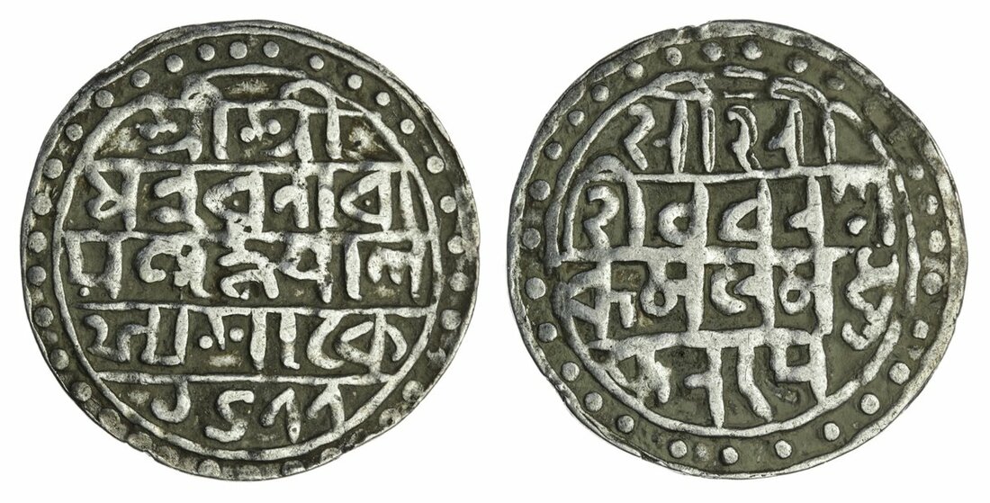 Cooch Behar, Nara Narayan (1487-1555), broad-flan Tanka, 34mm, 9.92g, Sk.1477, legends in Nagari: Śrī Śrī/ Śiva Charana/ Kamala Madhu/ Karasya, rev. Śrī Śrī/man Nara Nā/rā/yana Bhupāla/sya Śāke/ 1477, both sides within circle and beaded border (RB. 13; Bose A-7.3; KM. 35), about very fine