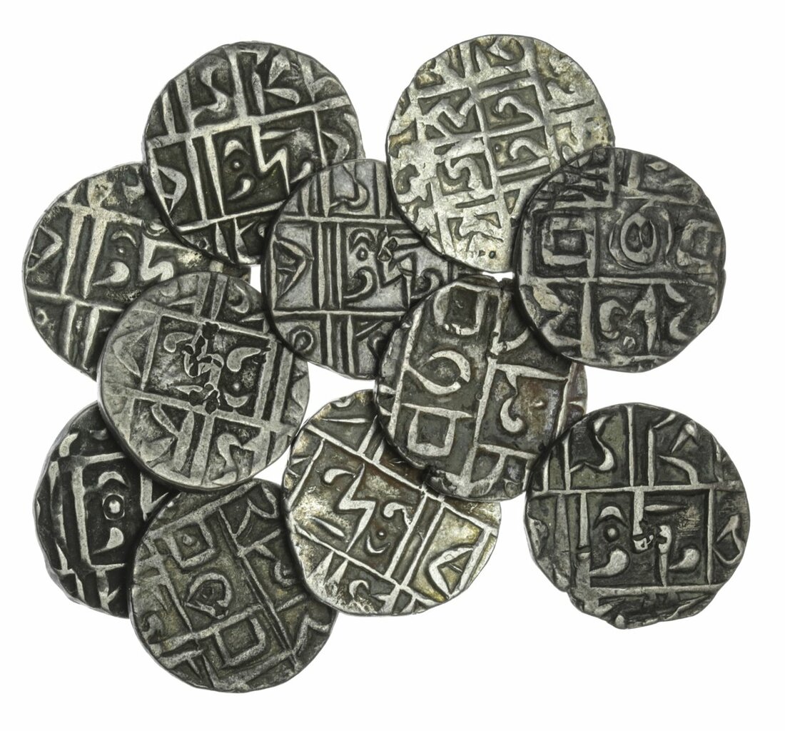 Cooch Behar, Prana Narayan (1633-65), Half-Rupee, Rupa Narayan (1695-1715), Half-Rupee, Upendra Narayan (1715-63), Half-Rupees (3), Devendra Narayan (1763-65), Half-Rupees (2), Rajendra Narayan (1771-73), Half-Rupee, Dharendra/ Harendra Narayan (1773-80/ 1783-1839), Half-Rupees (3), legends naming the respective ruler in each case (RB. 42, 62, 63, 64, 66, 68; Bose D-5, G-1, H-1, I-1, K-1, M-1; KM. 72, 109, 115, 121, 133, 141), generallyvery fine (11)