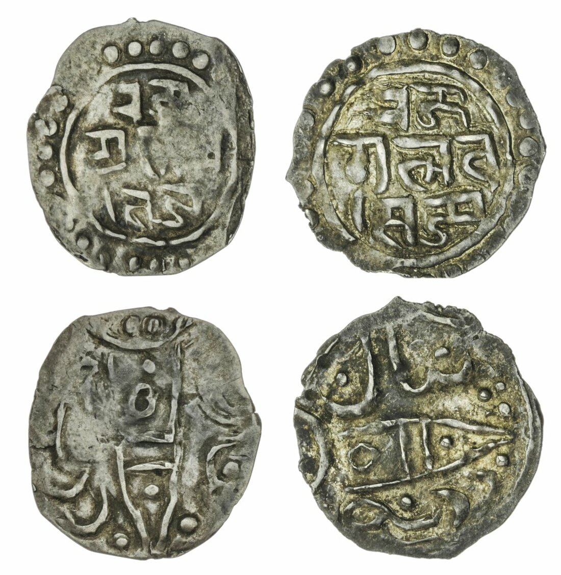 Ladakh (1842-50), AR Ja’u (2), 2.19, 1.79g, in the name of Gulab Singh, as previous coin, katar has circle on hilt, the first with one  bead on blade, the second with two (Rhodes, Garhwal and Ladakh 29; KM. 7.2), the first good very fine, the second with some flat areas, about very fine, scarce (2)