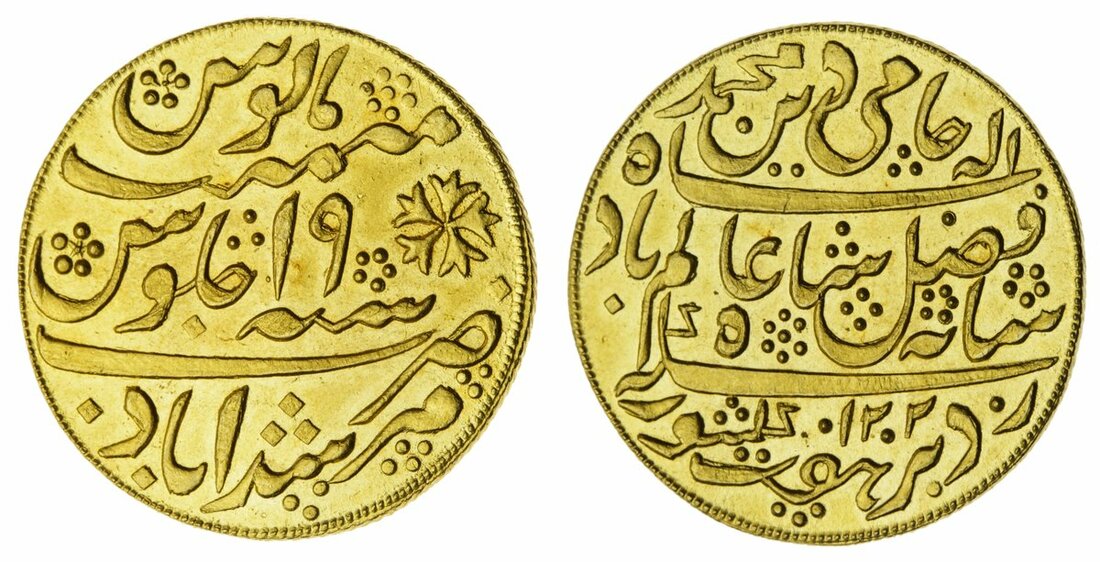 East India Company, Bengal Presidency (1793-1818), gold Mohur, 12.41g, Murshidabad (Calcutta mint), fixed date AH1202, ry.19, edge, oblique milling right (Stevens 4.3; Pr. 62; KM 103.1), about uncirculated