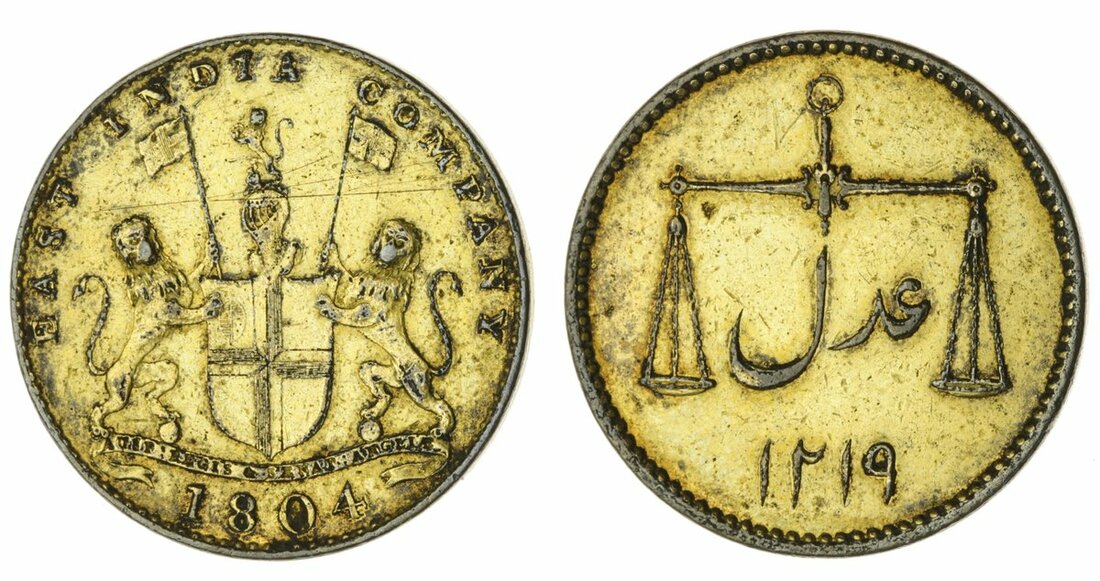 East India Company, Bombay Presidency, gilt proof Pice, 1804 / AH1219, Soho mint, arms of the East India Company, rev. scales with legend Adil (Stevens 8.59; Pr. 200), light obverse scratch and gilt worn from raised parts, very fine